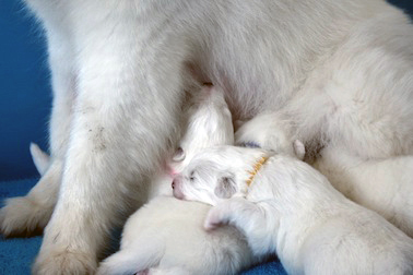 Mami Kalaya kümmert sich ganz liebevoll um ihre Babys und entfernt sich kaum von der Wurfkiste.